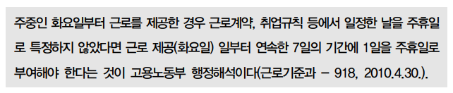 ∙ 주휴일은 반드시 일요일일 필요는 없으나, 근로계약 또는 취업규칙에 특정일을 정해야 한다.