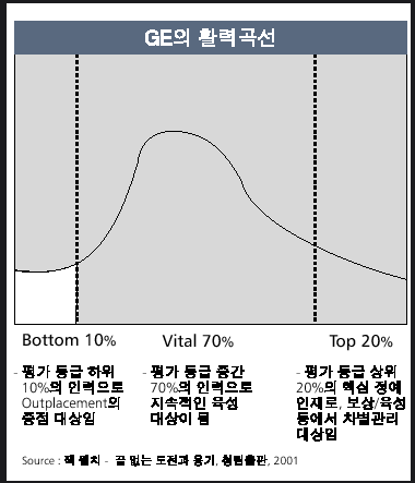위의 그래프는 GE라고 하는 회사에서 시행해 왔던 10%룰이라는 이름의 상대평가 제도였습니다 상위 20%에 속하는 인재들은 보상과 승진의 기회를 제공했고요 70%에 해당하는 직원들에게는 상위 20%로 올라갈 수 있도록 지원하고 하위에 있는 10%의 인원들에 대해서는 해고라는 조치가 내려졌던 다소 살벌했고 좀 잔인했던 그런 제도입니다. 구성원들을 이렇게 상대 평가를 통해서 줄을 세워서 잘하는 사람, 앞으로 잘해야 할 중간 사람, 그리고 이제 이 회사를 떠나야 할 사람으로 분류를 한 것입니다. 당시에 GE가 워낙 사업적인 성과도 좋았고 성장하고 있었기 때문에 수많은 기업들이 상대평가 제도를 따라서 도입을 했었습니다 그런데 갑자기 2015년 8월에 GE는 30년이 넘도록 사용해 왔던 자신들의 10% 룰 상대평가 제도를 버리겠다라고 선언을 합니다 새로운 변화는 도전해야 되고 창의적으로 맞서야 되고 같이 협력해서 맞서야 하는데 그런 효과를 얻을 수 없었다라는 것입니다. 당시에 미국 포춘 500대 기업을 대상으로 해서 상대평가 제도를 폐지하셨습니까라는 질문에 대해서 이미 폐지했다 그리고 지금 폐지하고 있는 중이다 혹은 조만간 폐지할 예정이다라고 응답한 비율이 무려 86%에 해당했었습니다 우리나라의 많은 기업들도 이 상대평가 제도의 한계를 경험하기 시작하고 지금 새로운 대안을 모색하고 있습니다.