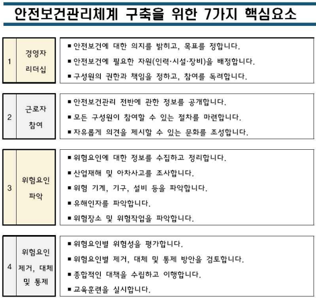 안전보건관리체계는 아래 7가지 핵심요소를 고려하여 구축합니다.