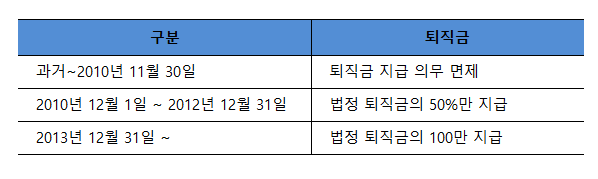 5인 미만 사업장에는 퇴직금이 적용되지 않다가 2010년 12월 1일 부터 퇴직금이 적용되었다. 그리고 적용율도 2012년 12월 31일까지 는 50%만 적용되고, 2013년 1월 1일부터 100%가 적용되었기 때문 에 5인 미만 사업장에서 장기근속자가 퇴사한다면 퇴직금을 기간별 로 따로 계산해서 합산해야 한다.