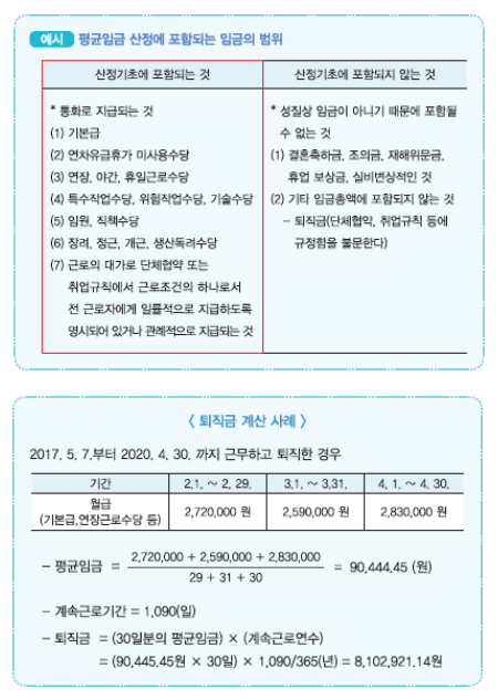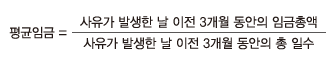 ○ 평균임금: 평균임금이란 근로관계 종료 등의 산정사유가 발생한 날 이전 3개월 동안에 근로자아게 지급된 임금의 총액을 그 기간의 총 일수로 나눈 금액을 말함(「근로기준법」제2조제6호)