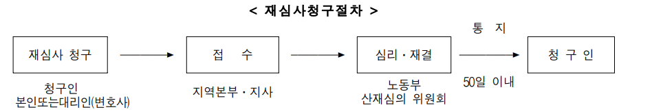 ② 재심사청구(공단본부의 심사결정에 이의가 있는 경우) 산재심사결정에도 이의가 있는 경우에는 90일 이내에 원처분을 행한 근로복지공단에 원처분을 행 한 근로복지공단에 재심사를 청구하면, 공단을 경유 노동부내에 설치된 산재심사 위원회에 회부되 어 심리․재결하게 된다.