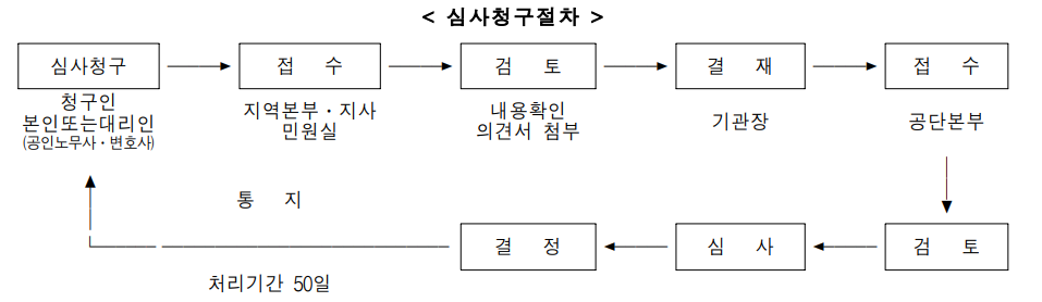 ① 심사청구(지역본부장 및 지사장 결정에 이의가 있을 경우) 관할 근로복지공단 지역본부 또는 지사의 처분(보험급여․요양결정․등급판정 등)에 이의가 있을 때에는 처분의 결정서를 수령한 날로부터 90일이내에 원처분을 한 관할 근로복지공단 지역본부 또는 지사에 심 사청구서(법 제88조)를 제출하면 공단본부에서 서류심사를 거쳐 기각결정 또는 취소결정을 내리게 된다. 청구인의 심사청구의 이유에는 원결정처분의 부당성과 청구에 증거 및 타당성이 증명되어야 한다.