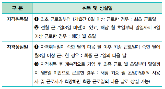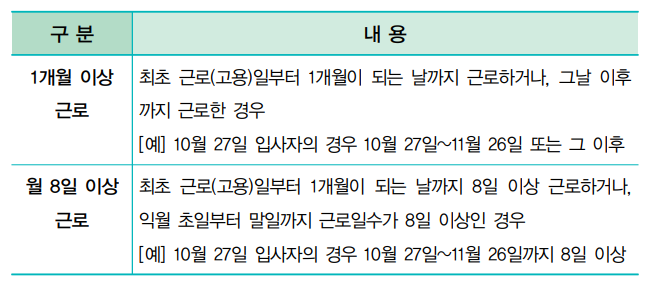 ① 일용근로자가 사업장에 고용된 날로부터 1개월이상이면서 월 8일이상 근로한 경우
